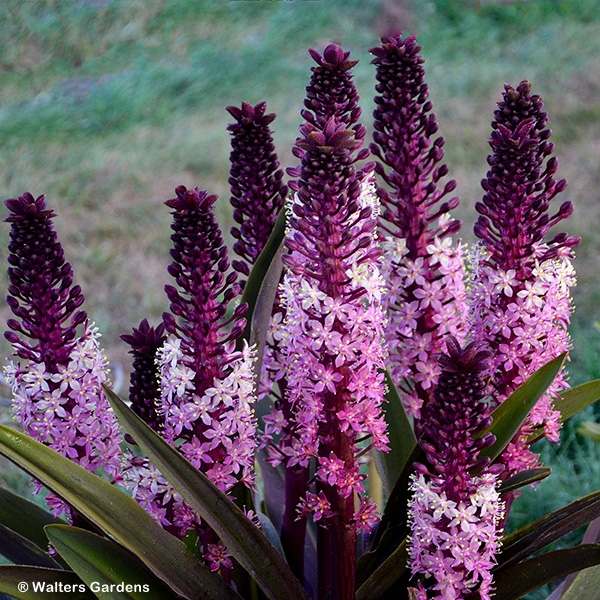 Eucomis 'Safari Adventure' features wide, strap-shaped leaves that emerge in early summer with a burgundy-green hue, often developing a wine-colored blush. As summer progresses, the foliage may lighten to a deep green. The leaves form a rounded mound similar to a Bromeliad. In late summer to early fall its clusters of purple and white star flowers are held on tall, strong, dark purple stems that rise above the foliage. They strongly resemble pineapples.