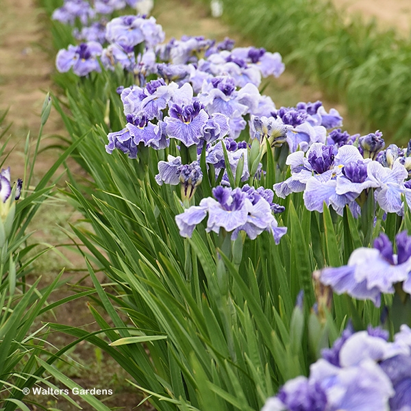 Iris ensata 'Center of Attention' is a true standout in the early summer garden, known for producing some of the largest flowers of all iris species. It features massive, dinner-plate-sized blooms with a distinctively flattened, beardless form. The flowers are a captivating shade of violet-blue, decorated with deep purple veining and striking yellow signals at the center of each ruffled petal. Reaching up to 36 inches tall, its elegant, sword-like green foliage provides a sturdy, vertical backdrop that maintains its architectural interest long after the mid-summer bloom cycle has finished.