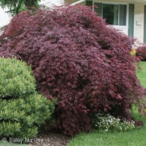 The Red Dragon Japanese Maple is a compact, slow-growing, dissected form Japanese Maple with an upright-pendulous, rounded mound that grows to 7-8 feet. Deeply cut, lace-leaf foliage emerge bright scarlet in spring turning a rich burgundy red through summer, and maturing bright red again in fall. Leaves retain good color throughout the growing season.