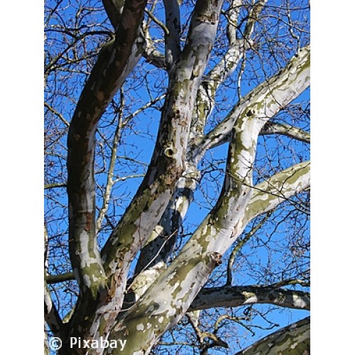 The American Sycamore is generally regarded to be the most massive tree indigenous to eastern North America. This enormous deciduous tree is usually single-trucked and can grow to over 75-100 feet in its long lifetime. It has horizontal branching and a rounded habit. Sycamore trees are native to lowland areas and grow best along streams, rivers and flood plains. The Sycamore is noteworthy for its brown bark which exfoliates randomly to reveal attractive creamy white mottled inner bark. Foliage is large and dark green with coarse marginal teeth. In fall the foliage turns yellowish-brown.
