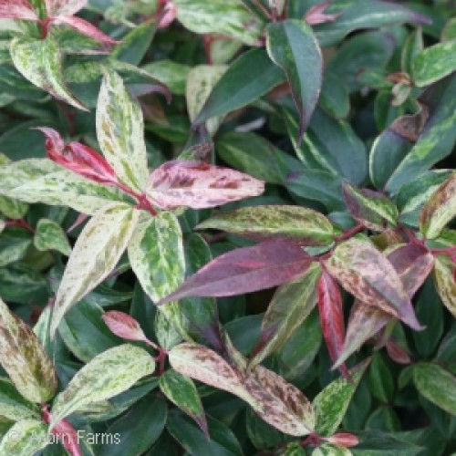 Leucothoe fontanesiana 'Rainbow' is commonly referred to as Rainbow Drooping Leucothoe, Rainbow Doghobble, Drooping Leucothoe or Drooping Laurel 'Rainbow'. It is a fantastic, multi-stemmed evergreen shrub that features arching, vibrant red stems with glossy dark green, spotted leaves that emerge pink, white and copper - very showy! Small, white urn-shaped flower clusters appear in spring.