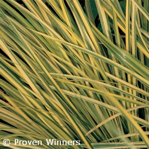 Acorus gramineus 'Ogon', commonly known as Golden Japanese Sweet Flag, is a vibrant, semi-evergreen perennial prized for its luminous, grass-like foliage. Unlike the tall prairie grasses, 'Ogon' is a low-growing mounding plant, typically reaching only 18 to 24 inches in height with a similar spread. Its narrow, blade-shaped leaves are variegated with bright butter-yellow and chartreuse stripes, providing a stunning "glow" in shaded or dimly lit corners of the garden. When bruised or crushed, the foliage emits a pleasant, sweet fragrance, making it a delightful choice for planting along pathways, in rock gardens, or as a colorful groundcover near water features.