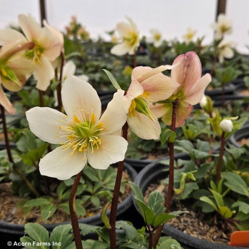 HGC® Jacob Christmas Rose features large, single, pure white flowers with golden yellow stamens. The blooms turn a rose pink in cool weather and pale green in warmer temperatures. This early November bloomer flowers the first year!