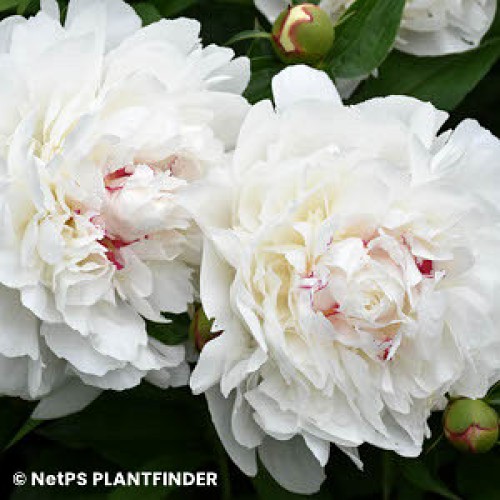 White blooms have red drizzled throughout the center. Noticeably fragrant. Blooms in late spring.