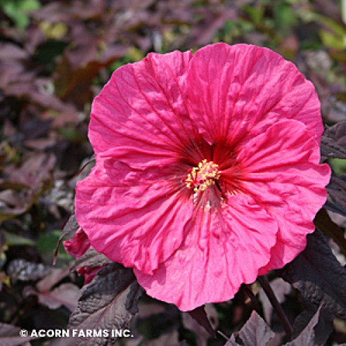 Hibiscus 'Evening Rose' PPAF is commonly referred to as Summerific® Evening Rose Rose Mallow. Truly a focal point in any garden with its showy combination of puckered, hot pink flowers and nearly black maple-like, leathery leaves. Compared to Hibiscus 'Berry Awesome', the foliage is much darker and the 8 inch flowers more magenta than lavender. It has an upright, mounding habit and is deer resistant and brings in the pollinators.