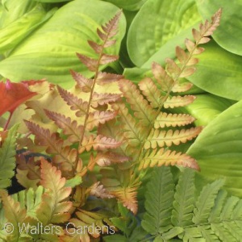 Colorful groundcover with pink fiddleheads that turn coppery orange as they unfurl. Fronds age to a lustrous dark green and remain well into winter.